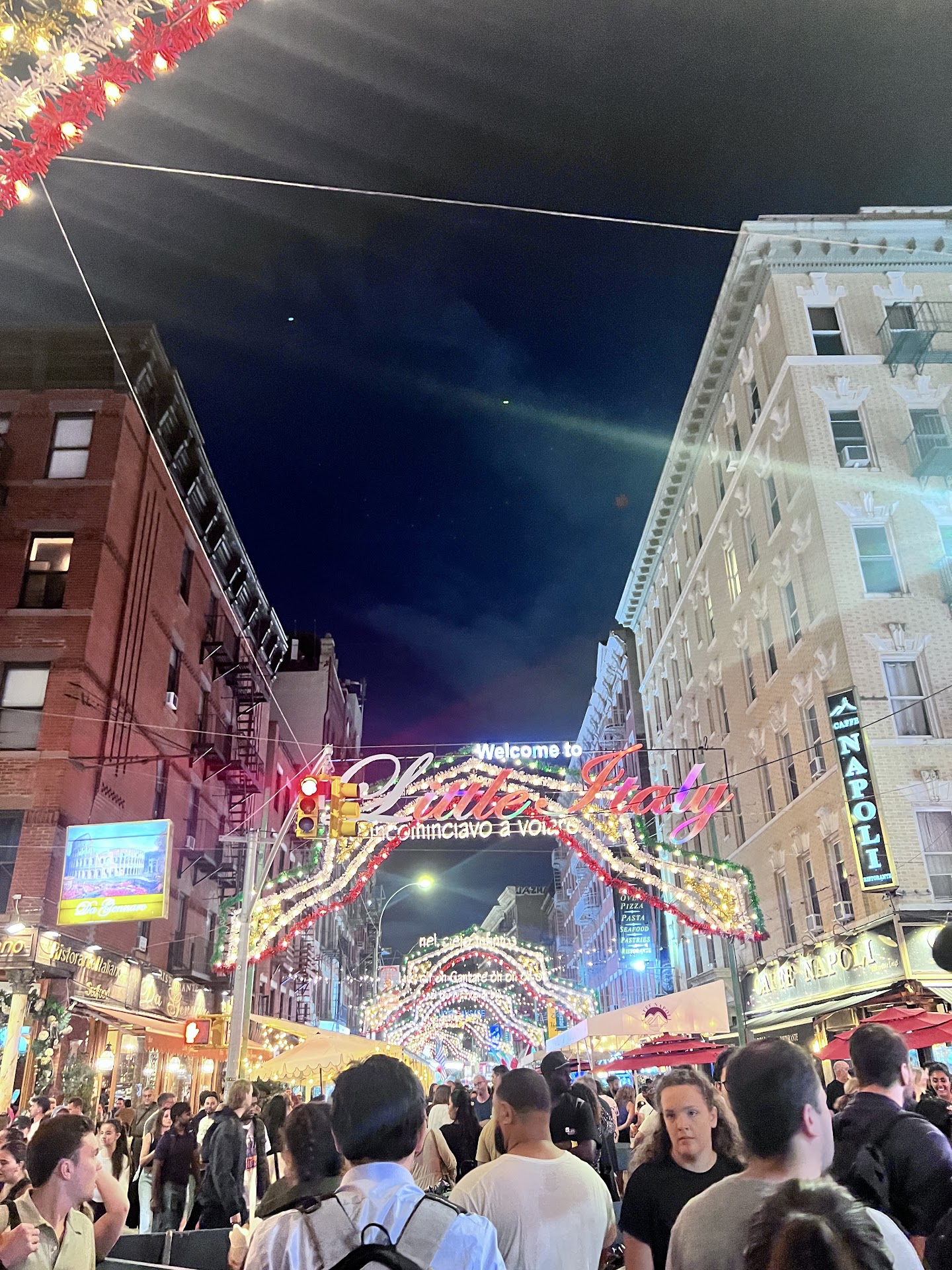 The streets of Little Italy come alive with: • Music and Entertainment: Traditional Italian folk music, live bands, and street performers set the tone. • Decorations: Twinkling lights, colorful banners, and festive garlands create an inviting and celebratory ambiance. • Crowds and Energy: The lively, bustling atmosphere makes it feel like a big family gathering.