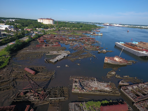 This location isn't really open to the public, but there weren't any "no trespassing" signs or anyone to ask us to leave. Be respectful. The land is thick with brush and very marshy. A lot of amazing nautical history here. Military vessels from WWII, vintage ferries, wooden paddlewheels, tugboats, cranes and more. The boats sit silently rusting away, some half-submerged with scurrying birds and the occasional industrial barge being the only activity. It is a serene meditative place -- some local folklore says it is haunted and there are lights and...