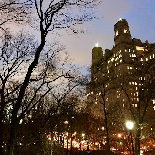 This is a lovely place for a sit-down at any time of day, perched up high on a small bluffâdiagonally situated just across from the landmark Beresford apartment house, one of the jewels of Central Park Westâabout five or six stories above street level, with a clear view all the way down 83rd St. to the Hudson on a clear day. The fact that it's essentially a sheer rock face down to CPW means that it isn't as quiet as some other places farther into the interior of the park (bit of horn-honking at rush hour, etc.), but that hardly matters. When the trees are bare, you can see the whole of the skyline, from the San Remo sweeping west past Columbus Circle, all of Central Park South, and clear on over to prominent buildings like the Citigroup Tower (a.k.a. 601 Lexington Avenue) on the East Side. It's...