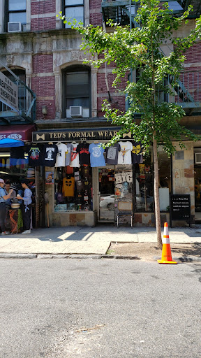 Whilst I was chaperone to 3 aspiring Broadway talents attending a 5 day Ripley Grier workshop in the Theater District, I was in search of rock themed tees as a gift for my son. To my dismay and chagrin the tourist trap gift shops here in the grimy times square area are completely bereft of rock tees, but stocked to the gills with small replicas of the Statue of Liberty and the Empire State Building. A maps googling of 'rock tees' lands several potential places of business, the least promising of which was a place calling itself 'ted's formal wear', sounding like a tuxedo rental shop. The name belies the true nature of the beast, as was revealed by the storefront photo (thanks Google). So I jump the orange line south, and after walking in the wrong direction for 15 minutes (thanks Google - am I the only person who is rendered directionally illiterate by the walking directions on Google maps?), I somehow arrive at the store. Before entering I am beconed by the owner of the adjoining business, an older bearded gentleman in semiformal business attire and a yarmulke who is in need of assistance in raising the security gate of his storefront. I knew I wasn't doing all of those push-ups in vain. I ultimately enter the store, and it is lit-tra-lee rock tee Nirvana. I found the tee I wanted, and if I wasn't needed back in the theater district in an hour I probably would have bought 5 more I didn't need. The owner was friendly and helpful. Best $30 I ever spent. Everyone should go...