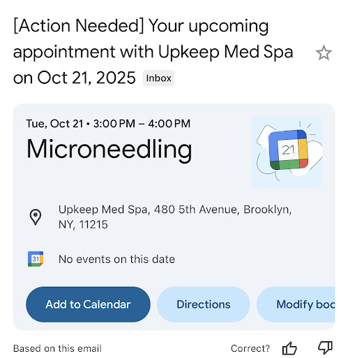 As a 1st timer, I DO NOT recommend Upkeep Medspa. Policy allots abt 15 min per service, regardless of how inexperienced you or your injector are. I had the pleasure of watching mine get visibly frustrated as I experienced a panic attack in the chair. Their job is to upsell & push procedures onto impressionable clients by creating doubt where there is none.