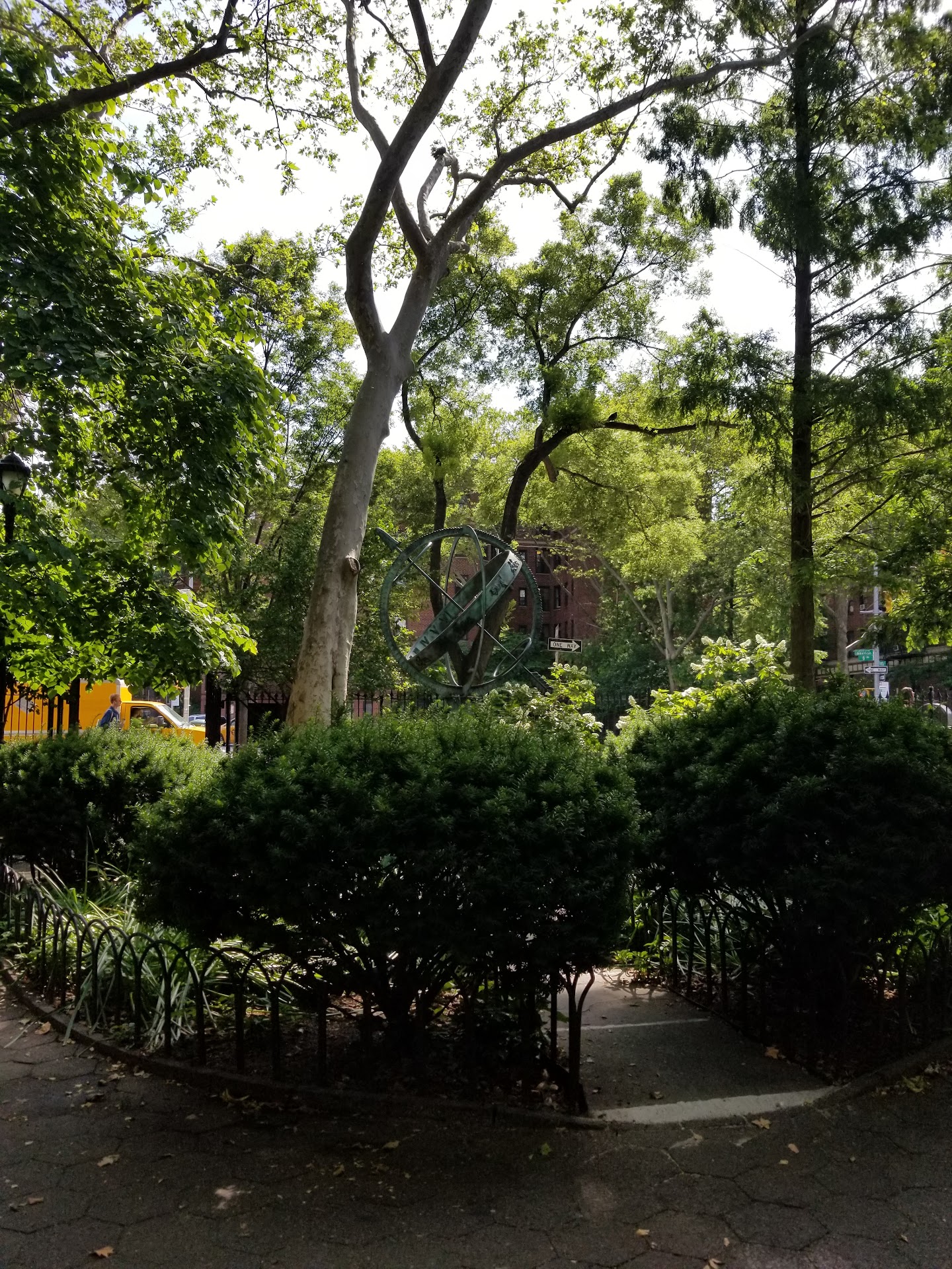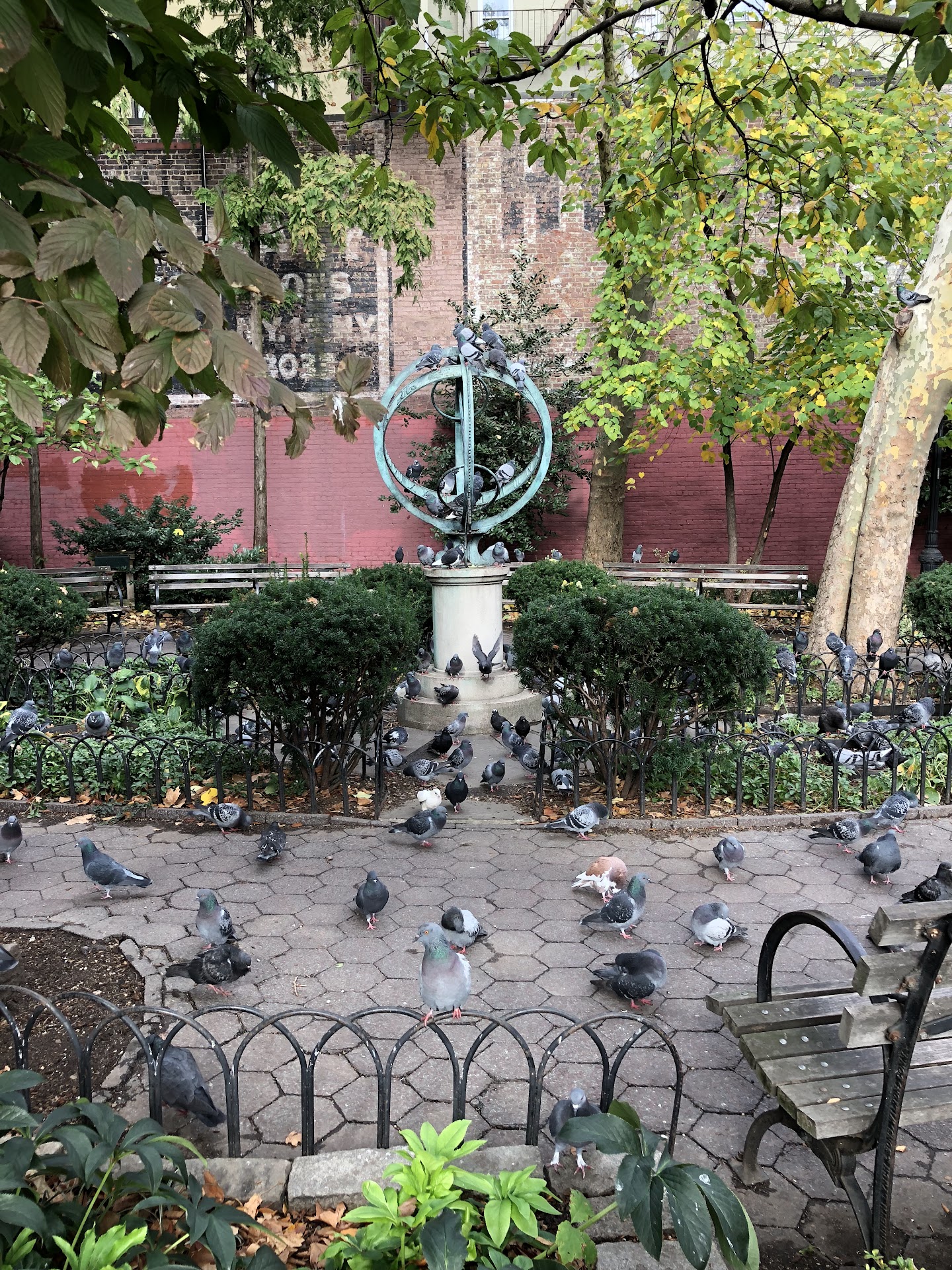 I really dont know what it is about this park, it may be the layout, the location, right next to a childrens playground, im not sure...but theres something special about this park. I always feel compelled to stop and sit for a few minutes when walking by. Nice, well aged & manicured trees provide shade to cool off a bit, but are old & tall enough to alliw for a good breeze. I know its not just me, just a week ago i stopped and sat & noticed someone had left thier lunch garbage on a bench across the park, but before i could even stand, another gentleman walked in, saw the garbage and went about cleaning it up & throwing itvaway, before sitting down to eat his own lunch. Its a special...