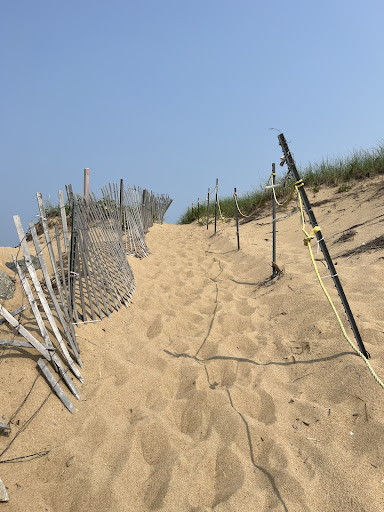 We went on the flat, black carpet on the sands type path to go to the beach, instead of the wooden boardwalk. Stay close to the middle of the path, behind the ropes because there are some poison ivy around the path. There were some remains of concrete structure at the end of the path. The tide was high when we went there and current was pretty strong...