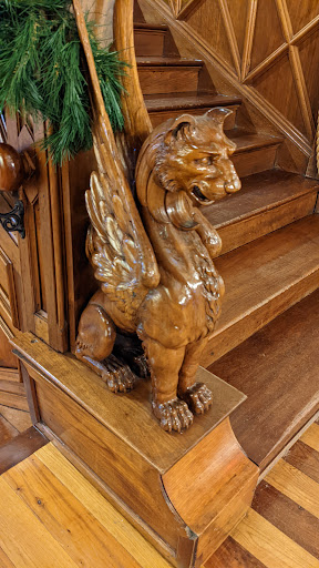 This location is inside of what appears to be an old home and is tastefully assembled. The ceiling wood work. And the arranged art make this a gem to the community.