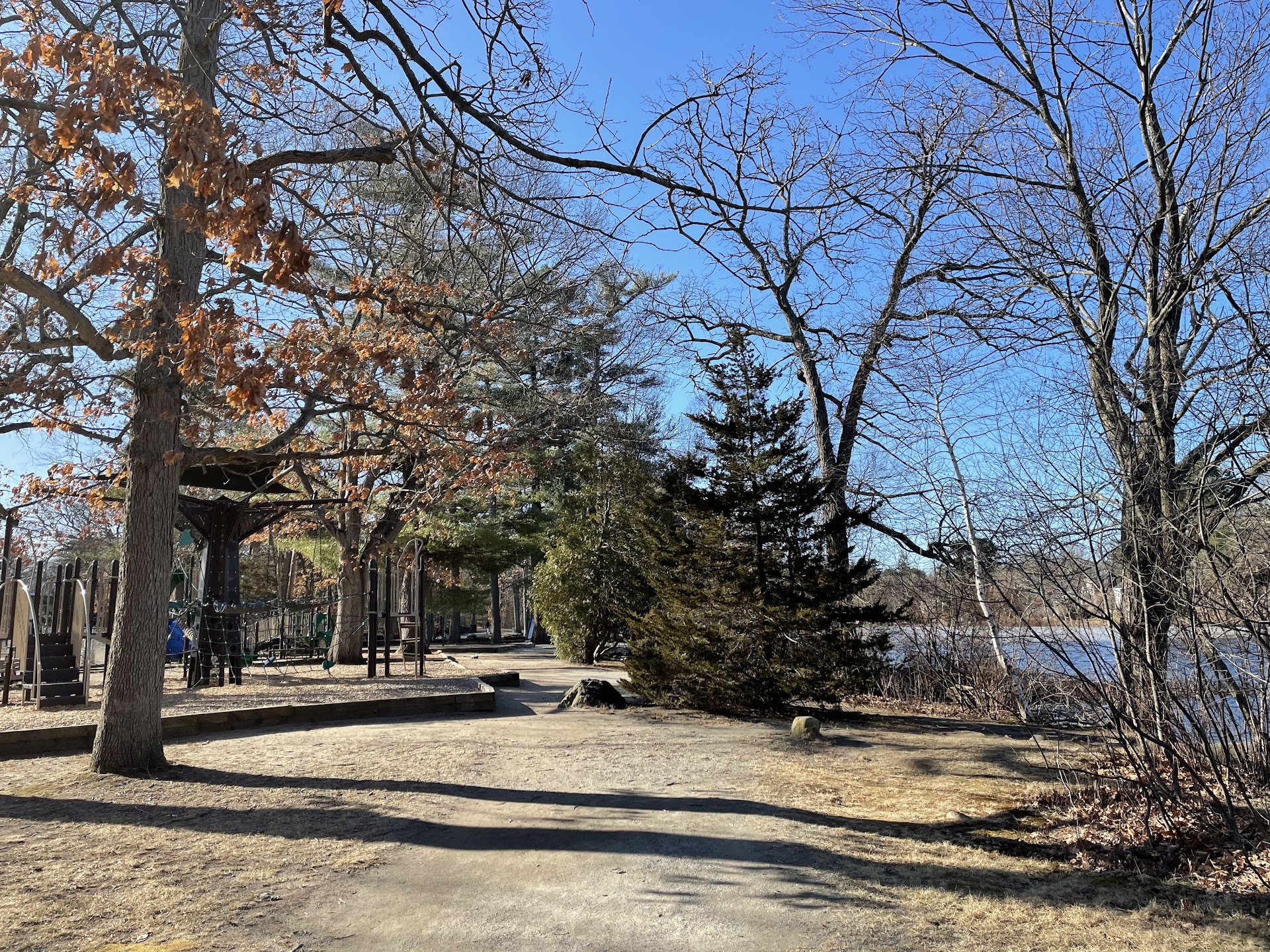 A hidden gem of a playground, picnic, and exercise spot along the Charles River, with clean public bathrooms and hand washing sinks, a big sand pit and toys. All looking out to the Charles River but at a distance that feels safe (with watching), with birds chirping away. Playground: A big Robinson Crusoe-ish play structure over wood chips for bigger kids with climbing, rope bridge, slides. A littler kid play structure with smaller slides, ramps, and fixed moving toys. A 4-swing set. A standalone big slide. Plenty of seating. Eating: A huge picnic area with around 25 picnic tables, a big raised metal fire pit, and public restrooms. Parking: Huge parking lot (free) with 5 handicapped spaces with what looks liked plenty of room for a wheelchair (or 2) to access the park via two flat gravel trails. Exercise: a 2 basket shaded basketball court, tennis court, big baseball field, and trail exercise structures (including arm and foot cycles - that's something fancy I've never seen at a park before, who needs a gym?). A running/biking gravel trail goes on...