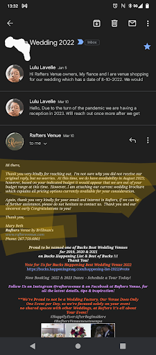 Read moreI was very disappointed with the communication. I have still not gotten to see the venue, but at this point have decided to go in another direction. When I saw Rafters on WeddingWire I fell in love and was confident I wanted to have my wedding there. I reached out through the WeddingWire app and got no reply. A few days after that I went to their website and submitted a request for information through there. Still did not hear anything back. I began to get discouraged but again I loved this venue and wanted to see it in person so I gave them the benefit of the doubt. I found a few different numbers online for Rafters so I called each one. I was able to leave a voicemail for one of those. I also sent a message to their Instagram and Facebook pages. At that point I did receive a message through WeddingWire apologizing for the difficulty with communicating, the reasoning was that there was a storm in the area that impacted every form of communication they use. I was understanding and we set up a tour for that Saturday. The day of the tour I received a message that the person giving the tour was not feeling well and that we would need to reschedule. Right at that moment I messaged back saying I hope she felt better and if we could do the next weekend. I never got a reply. Yesterday I texted again asking if we could reschedule. No reply. I am so disappointed because this appeared to be the perfect venue for us, but I cannot imagine booking and having this hard of a time getting in touch...