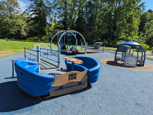 Read moreGreat park up to age 12 or so. Which, for playground parks is really good. Expansive wooden play structure with lots of ramps, stairs, lookout points. Several large climbing rocks, giant saucer swing, giant rope climbing web, and a long Zipline round out this park's amenities. If that's not enough, there's a little stream with wood bridge for when they're tired of everything else. And there's no wood chips! Several picnic tables and plenty of shady grass. Basketball court and a skateboard park...