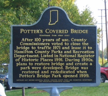 A detailed, documented History of Potter's Bridge (or Potter's Ford Bridge) can be found on the Indiana State Government website or The National Historic Registry website.
