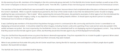 Read moreArt is supposed to make people think and feel. Removing art because someone has a negative feeling about it is unacceptable. Refusing to display works of art that may be controversial or make people uncomfortable denies people the opportunity for thoughts and feelings and ultimately growth. In 2023 the Arts Center hosted the Norfolk Annual Pride Fest, now in 2025 they are censoring queer art. Very disappointing. I will no longer support them as long as their stance...