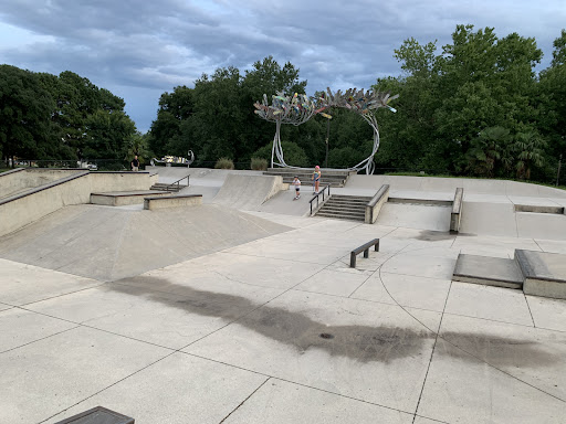 I take my son to the skate here every so often and we give a 4 stars in the aspect this park has been therapeutic for my 8 year old adhd and development (boredom, speech, self awareness, impressions etc.) being around them ghetto older kids helps him grow up from a whining baby into "I don't cry no more mama" pre teen. He definitely feels like he's at home skating with the skaters and has def met his match being around older hyper kids.