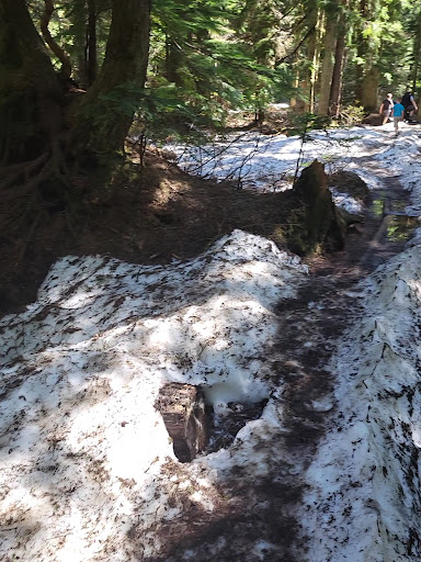 The trail was makeshift in some spots but not bad overall! (MAY 2023) There was snow on the Franklin Falls trail still (a LOT of it), but on the Wagon Road trail, there was hardly any snow! The trail does disappear in a few spots but was easily found again!