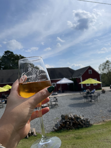 What a lovely little winery! Very cozy and homey—not the somewhat snooty atmosphere one might expect from a typical winery. The staff were incredibly friendly and accommodating. You could tell they love what they do and are proud of this place. We got a little history of the farm and vineyard, and even advice on how to hike the adjacent trail which leads to a lovely tree bathing grove and a replica of the Hoover Dam! We did a wine tasting flight and really enjoyed all of them, particularly the Cabernet Franc and the Barbera—a variety we’d never heard of and is apparently only found at this NC winery right now. (We bought 2 bottles!) I would classify these varietals as somewhat lighter and less robust than their California counterparts, but that will appeal to some. We thought they were very flavorful and subtly nuanced. Can’t wait to see what else they put out in the future. There is plenty of outdoor seating and space. They have a fire pit and portable heaters as well. You can also purchase charcuterie and small plate items to accompany their delicious wines. Grassy Creek is a wonderful, laid-back place to enjoy a...