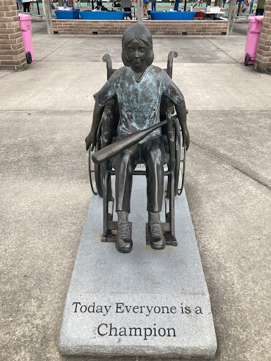 The Miracle Field at Olsen Park's goal is a special and inclusive place. It hosts sports events for individuals with disabilities, and it's designed to provide a sense of community and support throughout the space. One highlight is the inspiring âToday Everyone is a Championâ statue of a girl in a wheelchairâsuch a powerful symbol of inclusion and strength.