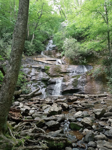 The falls are pretty, the hike is short, but not exactly what I'd call easy. It is climbing up, not just a walking path. Also, the directions are not clear or perhaps, not up to date. Our NC waterfalls book misled us completely and we ended up on the river loop trail, hunting for the waterfall. 😬 To get to the fall from outside the campground, you must park in the lot across from the campground, walk across the concrete bridge into the campground, then take the yellow blaze trail on the left. Once you cross the wooden bridge, watch for the blue blaze trail to Mt. Mitchell lead off to the right. Do not take the blue trail. THEN there is a white blaze trail marked easy that leads to the waterfall. Take the white blaze trail. It crosses the road. Goes up a few concrete steps, then climbs to the falls. Good...