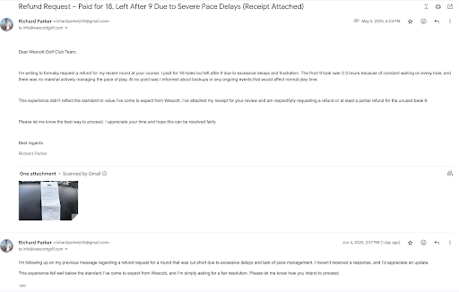Read morePlayed a round March 5 2016. It will be the last one. I have been playing this course since 2002 when I moved to the area. Bought a house on the course several yeas ago, so this is hard to say. Wescott is the most poorly managed golf course I have ever been to. 5 to 5.5hr rounds. People hitting into you while you wait to hit your shot. BLUE JEANS, I'm sorry that is like a cardinal rule of golf, collared shirts and no blue jeans are rules of golf. And no I'm not 80 years old I'm only 34 and I do belive in those rules. There are also courtesy rules. If there is a group on your ass waiting on every shot for ten min then u need to let them play through especially In the afternoon when you are fighting a clock and darkness. That's what happened to myself and my 2 other friends that both own homes in wescott and sware they won't come back. We called the pro shop and it felt like we were being interrogated by police. They obviously didn't want to talk about it. Finally they say they will send someone out. Well I'm not sure what good it does when they just ride by in the cart and don't stop to say anything to anyone. Very poor service. They could have told the group in front of us to let us play through or pick up the pace a bit. We were a 3some waiting on a 4some for 10 minutes on EVERY SHOT. But that's what u get at wescott. You will never see a ranger on the course, all they do is take your receipt, wright down your cart number, tell u which 2 nines to play and say have a nice day. Then you get to the tee box and there are 4 groups waiting to tee off. Zero control of t times. U can make a 2 o'clock t time, show up at one and just go. There is no one stopping you. Also during our round there was trash all over the course, trash lying next to the trash cans where the trash cans were empty, absolutely disgusting, that's the type of person that wescott encourages to come play the course. If there was a ranger patrolling the course while play is going on mabye he could pick the trash up so people don't think this or mabye he could catch the people doing it. But that would be way to easy. I have played here when there are people walking, riding bikes, riding skateboards, scooters, playing games, having paintball wars, I've seen it all and management has FAILED MISERABLY to fix any of it. Again, this is all hard to say because I do like this area and I'm not moving anyware anytime soon. I just wish they would get this place under control. But I guess if they are okay making money being the dirt track of North Charleston then they have accomplished their goal. There are many other good courses in the area, I suggest you don't waste your money at wescott. It's so bad I would spend 20 dollars more not...