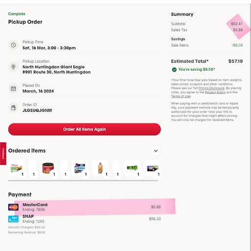 Honestly, if I could rate this specific Giant Eagle (North Huntington Plaza by Target), it would be negative 5 stars. A few years back I realized they were taxing me (before someone telling me groceries ESPECIALLY EBT recipients do not get taxed on food.) For almost a year I had to do curbside pickup due to having 2 small children, they would always ask for my debit info for "taxes and fees." (Pics as proof included) I have every receipt to prove it. I figured today 8/2/2025 I'd give them a second chance instead of my usual walmart because I know they always have both of the formulas I need , went in for formula on WIC, got a watermelon, strawberries, and almost all of my WIC covered formula I could get from the shelf (I have triplets so Im sorry, but they gotta eat and Im a single mom so its hard to get out to the store as it is with the babies AND load groceries) so anyways, I double checked all my items were WIC approved with my wic app... get to the register. My card covered SOME but then they tell me I had a leftover balance of $243. I tried to explain its all covered, its the second of the month and I triple checked everything before rushing to the register while my 3 month old triplets waited in the car with the AC on with a friend of mine (not always an option for me, as other people have lives also.) So anyways, the "manager" comes over, noticeably irritated. I asked her nicely to not give me an attitude. She then tried to say it wasn't the systems faught, its my WIC (NEVER had an issue at Walmart before) and of course they say to call WIC on a Saturday to figure it out. Which i cannot figure out until Monday at the earliest. So Im without my 2 daughters formula until I have a chance to go back into Walmart and get it LIKE I should be able to. Not sure if my benefits are still available or taken from what they did take until I get a chance to try again at Walmart.