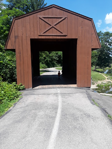 To access the trails, make a right at the sign before the covered bridge and head straight up towards the woods and you'll see an opening in the trees. There will be a short section before the trail spits you right out again where you cross a wooden walking bridge.