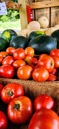 Lovely large ripe cantaloupe, large slicing tomatoes, watermelon. In a refrigerated unit, peppers, green beans, wax beans, zucchini, more. Fresh garlic. Eggs. (We saw where people had pulled up to the stand, then when leaving, drove to the road across their lawn...I don't think they would appreciate that.) I am adding to my review. The cantaloupe is probably one of the best I've ever had. Sweet, perfectly ripe. Very large. Hope there are some left when we go...