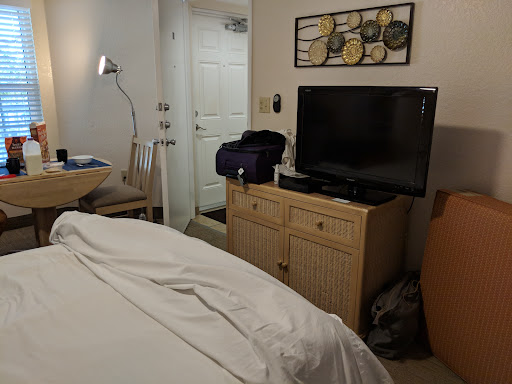 This Interval International (aka: II) Exchange, at the Redington Ambassador (aka:RA) was the smallest most uncomfortable room. II said it was a suite w no bedroom( In past stays, this turned out to be a comfortable hotel-sized room (w/ one or two beds plus a small kitchen & bathroom). NOT this time. RA put us in a tiny third bedroom attached to a much larger suite that was locked off from our room. Our room was under 300 square feet (total!). It was so small that we couldn't even open the entry door while sitting at kitchen table. The refrigerator was a college dormroom size. And kitchen sink wasn't large enough to wash a full plate! The one window looked over a parking lot w/ a portapotty and work trucks below. We asked to be upgraded to a larger room (before we checked in) & were told upgrades must be done through II . II claimed upgrades were up to the location. The next day we went to the office front-desk to check in & request a larger room. The woman argued that they were FULL (&, if we upgraded, it would cost the full $1500 for the week). So we just remained in our tiny claustrophobic room. THE WOMAN LIED. Over the entire week we counted 6 unoccupied rooms just on our wing!). And the suite that we were attached to was one of the unoccupied rooms! This empty spacious suite was attached to our tiny one (see pic w open door to suite on left and open door to our room on right) . We looked inside to see an actual living room space, a kitchen & two bedrooms (Our room was the size of the smaller kid-sized bedroom in this room#107-suite ..their bathroom was even larger than ours. Not only did the woman lie about availability, she acted like RA was doing us a favor by 'allowing us' to stay w/ them. I even had to plead for an extra pillow since she said only one pillow per guest was allowed. My husband asked if they had an ice machine (since our refrigerator's freezer's ice tray only makes 6 small ice cubes!), & she curtly replied "We don't do that". The Murphy Bed's wooden frame (our only bed) was too large for the tiny room, giving us little space btwn the frame & dresser, which meant us banging our shins on the corners. I still have multiple bruises on my shins (ouch!) My husband's only positive statement was that the towels were so rough that they were good back scratchers! (fyi: The one closet, for clothes, wasn't big enough to fit a regular-sized suitcase. Other closet was for AC and utilities....Hence, the suitcase had to be put on dresser and next to bed) Location was fine. It's just walking distance from the beach like most of the places in the area. There were plenty of avaibilities (probably due to the Red Tide making the water still unswimmable & the air, when the winds blew, made us cough. I would highly recommend AGAINST STAYING @ the Redington Ambassador. Personally, I wouldn't become an owner to such a place (since I believe you're only as good as the way you treat your guests. And theirs was shameful.) Interval International.. since you claim you aren't aware of the exchange room sizes & condition... I am letting you know. You should take them off your list of exchange locations. This room was rediculously tiny, the woman lied about availability for upgrades and the one worker, in the office on Sunday & Wednesday, treated us like we were an annoyance. There are hundreds of places to stay in this & surrounding areas. I'm certain there are more gracious & accommodating ones in which to stay. I would've given this room '0 stars' w/ review if it were accepted. Better reviews are either Owners or paid reviewers. Stay away from this place. (Note to II: I have many people ask me if I am satisfied with Time Sharing and is it worth buying in with you. *I was exchanging my spacious suite w/ a kitchen & 1 bedroom in AtlanticCity, NJ...w/ views of the ocean & harbor. If this is what you offer, for exchanges, then what do you think I will tell them?) 0ct 27...