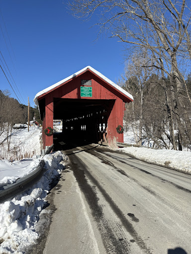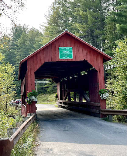 Given the abundance of covered bridges in the immediate area you might miss the Upper Cox Brook Covered Bridge which would be a mistake. According to Wikipedia: The Upper Cox Brook Covered Bridge stands west of the village of Northfield Falls, crossing Cox Brook, a tributary of the Dog River. It is the westernmost of three covered bridges on Cox Brook Road; the other two are the Northfield Falls Covered Bridge (crossing the river), and the Lower Cox Brook Covered Bridge. The bridge is of Queen post truss design, its two trusses 51.5 feet in length, and resting on abutments either faced or rebuilt in concrete. The trusses are set at an offset, skewed to form a parallelogram. The bridge is covered by a metal gabled roof, and its exterior is clad in vertical board siding, which extends around to the insides of the portals. The bridge deck consists of steel I-beams supporting wooden planking. The trusses no longer carry the bridge's active load, and only support its superstructure. The siding does not rise all the way to the roof, leaving an open strip between them, and there are long rectangular strip openings on the sides, sheltered by...