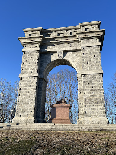 The Memorial Arch of Tilton was built in 1882 by Charles E. Tilton. It stands 55 feet (17 meters) tall and is constructed of Concord granite. The arch was inspired by the Arch of Titus in Rome, with its surfaces modeled in the rustication style that was fashionable for Romanesque revival buildings at the time. Interestingly, Tilton chose to build this monument to peace on top of an old Indian fort at the apex of a local hill. The arch sits atop a hill 150 feet (46 meters) above the Winnipesaukee River, and its foundation goes into the earth 16 feet (4.9 meters). At the base of the arch, you'll find a 50-ton sarcophagus and a red granite Numidian lion. Tilton originally intended to be buried in this monument, but he was instead buried roughly a mile west, in Park Cemetery in Tilton. When the Memorial Arch was built, gas lamps were placed at each corner to illuminate it, making it the only illuminated object for miles since there were no electric street lights in Tilton at the time. In the early 1980s, the monument was added to the National Register of Historic Places. It has since been repaired, cleaned, and surrounded by a park with picnic...