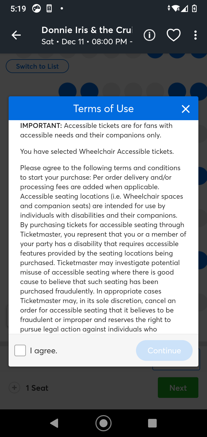 Read moreI paid for a handicap accessible seat. Per Ticketmaster it states the seat I chose is for wheelchair accessible or handicap accessible. I paid good money for my seat as I have to use a walker. It was the end seat on an aisle, so I would have a great view since they talk your walker away and I am unable to stand for the concert. Well, this foreigner usher said he had to go speak to someone about wheelchair accessible. Well this other security person comes up and says it's for wheelchair accessible only (I can't see how someone in a wheelchair can fit in this cramped folding chair seat that is attached to the ones next to it), and moves me and my friend to the other end of the row so now I'm by the outside wall, and missed the whole show because now I have people standing in front of me the whole time. I paid for my seat and my friends seat which was a companion seat for someone needing a handicap accessible seat. To make matters worse, they gave my seat to someone who was not in a wheelchair, let alone not handicap at all, no walker or even a cane. So I paid good money to have an aisle seat so I can see, forced to move to another seat for someone with a wheelchair, only to have someone get my great seat that didn't even have a handicap. Don't know if I'll ever return there again. This is second incident I have had there where they treat someone with a disability like a burden. I will be contacting Ticketmaster, and maybe...