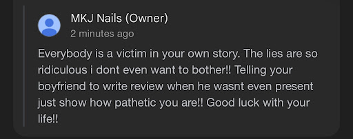 Read moreThe last 2 times I’ve been there service has been good. First time was the best, second time was good, this time wasn’t at all. I’ve been messaging with MKJ for a while (like months) over a detailed design I wanted done on a gel manicure. They said it wouldn’t be a problem and quoted me a price. The design has intricate and detailed designs on 8 nails and I decided for the other two nails I wanted dots going down the nail, matching the colors or the other designs. They quoted me at 10 designed nails being $25 plus the cost of whatever manicure I chose. Ok, that’s fine. The designs are awful (not sure how to add a picture on here but I have pictures). The manicure is lumpy and not filed properly. I have short nails anyway but now they’re rough and jagged. I asked for my money back to get them fixed and they said they would give me the money back for the designs and then in the next sentence said they’d give me half the design money back due to the manicure and time spent. They also said that I “added two designs” and was originally quoted for 8 designs and she did 2 designs for free. I have the messages which say 10 nails for $25 at $2.50 a nail!