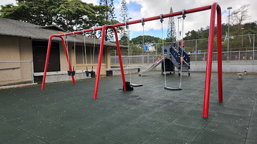 But here's the real deal: they just hooked us up with brand new swings! Swings are legit hard to find these days. This park also has a massive field, a tennis court, and a basketball court. It's right next to the school, and those Koolau mountains in the back? Dope backdrop for real. It's a killer spot to chill and...