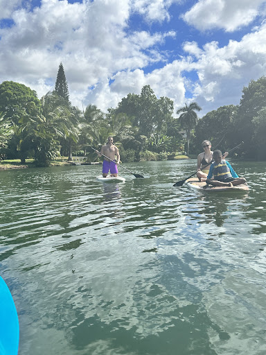 Most surf and SUP rentals hand you a board, point vaguely toward the ocean, and wish you luck, then giggle as you walk away. Not here. At Blue Planet, you literally walk your freshly-rented paddleboard ten feet to their private dock, step right onto the river, and suddenly—boom—you’re gliding through Hale’iwa’s lush, tropical paradise like it’s your own personal waterway feeling like the Duke himself. It feels almost too convenient, like a cheat code for vacation. Like a vacation from your problems.