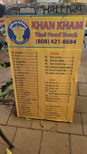 While in.Oahu, we decided to travel to the North Shore. While driving around, we saw a few food trucks and decided to stop for a bite to eat. We went to the Khan Kham Thai food truck. They have many options to choose from, and it was hard to decide. I ended up ordering the spicy garlic shrimp, and my buddy got the fried pork belly. That shrimp, hands down, was the best shrimp I have eaten. Perfect spiciness and loads of garlic, perfect balance. I was extremely satisfied with what I ordered! It came with white rice and a slaw. The slaw tasted great, unsure of what all the dressing contained, but it was very good. Everything on the plate just went perfectly together. I have to say, since eating that, we have to go back before we leave the island. It's a must! Also, that fried pork belly was amazing as well... We left this food truck SUPER SATISFIED. Prices were very reasonable, and it was a chill atmosphere. The lady that took our order was very friendly. Oh..almost forgot try the lime or tamarind juices if you visit, those were great as well. I HIGHLY RECOMMEND this truck. You'd be missing out if you don't. If you read my review, please hit the like...