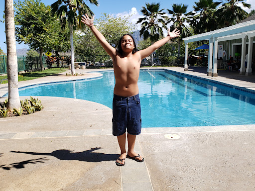 Very nice community pool. Pool is limited to residents and their guests. There is (obviously) a pool, two restrooms, outdoor tables, and parking. There is an indoor area with a sink, outlets and a fridge. Good space for a get together. There are garage doors that separate the indoor area from the pool. A nice pergola provides shade also. Very nice, loved coming here.