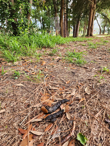 I love this shorter technical park. My only gripe is that the last 3 times i've been, theres been more people walking their dogs on the course than actually playing. They stop and take a leak here, then there and repeat. There's a dog park you have to pass on the way in and multiple open fields as well as a path around the park. I've never seen someone walk their dog on a golf course, and none of them are ever playing. As you can see, this picture is 10 feet from the basket. It's still a fun course. Just watch out for the hazards. Somebodys gonna have to break their ankle before they repair the tee boxes. You can lose a few disks here as a beginner if you're not careful. Excellent shade...