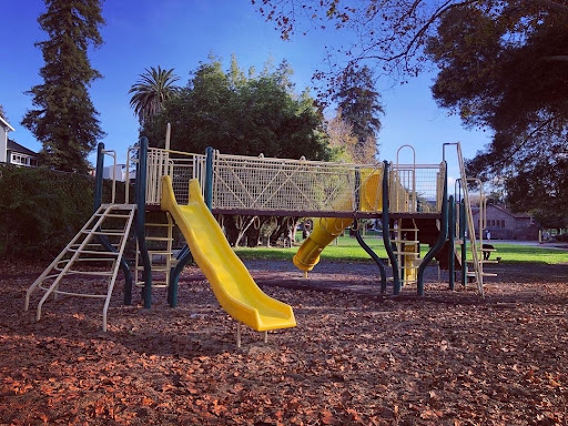 The larger play area sits below huge shade trees (perfect if it's a hot day). It has some really unique features like a wide climbing ladder, a long bridge and two tube ladder. This play structure also has two slides (tube and straight), steps, and learning activities. In this same area is a swing set with standard swings. On the other side of the park is a smaller play area geared towards younger kids. It has steps, a slide, and a ladder. This play area is on sand and has many community donated toys to add to the park time fun. The huge grassy area between is w great place to kick a ball, throw a frisbee, play fetch with your dog (signs say no dogs but they were there), or have a picnic below the redwoods or at one of the picnic tables with bbq. Don’t miss the community garden (not sure of the rules) and the historical area of the park with photographs of the park’s namesake and statues of his beloved mules. 🐴 While it’s not a fully gated, there are barriers separating the park from the road. Be sure to check out the black top design...