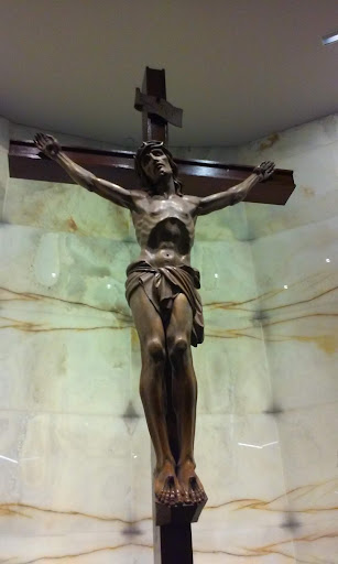 Thee Crucifix below is downstairs in the Moseleum either take a elevator Or walk down 2 flight s of stair When you lst arrive downstairs The huge statue of the Pieta will be there The Pieta is when JESUS was taken down from the crucifix an placed in His MotherMarys Lap... That's why I only speak for myself I like to walk the long beautiful marbel floor in the Moseleum feels like I'm walking on a mirror then before I reach the crucifix theres a sense of Reality sets in!!! Also; from St. Francis De Sales Cathedral there's an alternative before you arrive at the Foot of the Cross Google searches for Cathedral Christ the Light Mass Schedule service schedule and Google search a tour through the Catholic t Cathedral of Christ the Light 2121 Harrison Note: Google Searches Because thee Cathedral is not your average looking Cathedral 21st century Building with a whole lotta stories how an why...