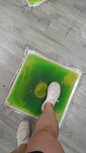The library is nicely decorated with the planets of the solar system and has squares with colorful liquid inside of them taped to the floor that you can walk on. My kids were so excited about these!