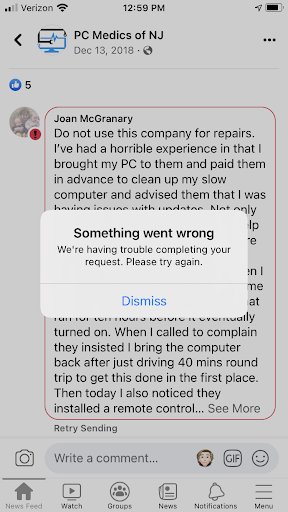 Do not use this Company for repairs. They are abusive and dismissive. They charged me $110 to tune up my PC because it was running slow and when they returned it, I started it to find a blue screen that lasted for ten hours before it actually turned on. When I called to Complain Eric was rude and dismissive.I hung up frustrated only to have this man call Me 10 times in 4 minutes on my cell without even leaving a message. On top of that they installed an app on my computer to allow them remote control and wouldn’t allow me to delete it as they are now the Administrator of my PC instead of me. When I messaged them to get their help to change this back, I was blocked on Facebook. See photos. I plan on taking this company to small claims court if they didn’t tell me how to change this ** in response to your response, you are a liar. I didn’t do anything of the kind. I have screen shots of how long my conversation with you was Eric and it was 1 minute call not twenty and I didn’t scream anything I hung up! You weren’t there when I dropped it off,so you don’t know that I did tell your sweet prof coworker that I was having problems with the update. Ask him. I hung up with you after a minute because it was clear you were trying to make me feel responsible or stupid instead of trying to help. You also never mentioned the fact that you added a program to my PC which is still there and you are still the administrator on my PC that’s a form of ransom. I will see...