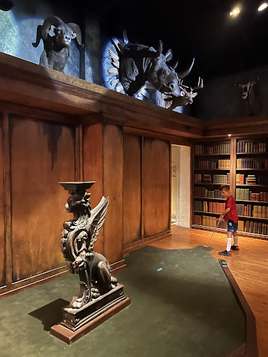 The set pieces in this place are wild. We bought the best valued combo in the world. Not only do you get to engage in a luxe, air conditioned, and pristinely themed 18 hole mini golf course, but also you get access to the brand new “haunted walkthrough” a walk through a haunted set of rooms with animatronic ghouls and representation of the undead, but also freakish rats and strange smoke. Let me tell you, this place just kept going. I swear it didn’t look that big from the outside. “Very valid point” says my golfing acquaintance. If you are sensitive to loud noises, strobing lights, or have any serious medical illnesses, maybe step back because i will say there are some flashing lights and smoke elements that are of top volumes. But don’t steer away because that was a great experience, despite the fact that we did it with two teenaged girls. As for golf. There may not be cultivated greens, but the course blends fun and risky elements leading directly to the hole AND a safe route just as reasonable. The golf takes you through various rooms with significant different in decoration, but the highlight is the black light room. EVERYTHING shines…even where the sun don’t. Now, I obviously didn’t write my name anywhere and it definitely wouldn’t say “Sues Connect 4” but if i WERE TO, it would be directly on the left side of the nose on the marble woman statue. My golfing acquaintance also smartly added: “Alright. We were stuck behind this absolute SWEAT of a golfer, but I didn’t mind a bit as the combination of the rocking tunes and the bone chilling ambience made me more than willing to…um…be in there for many minutes while this man lined up his...