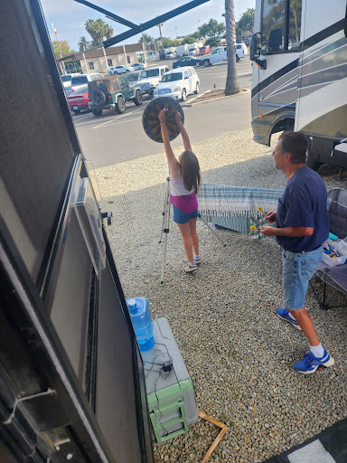 Elks Lodge Oceanside Let me start by saying that of all of the RV camps & military famcamps that we have visited. (and we have stayed at quite a few). It would be very difficult to find an RV park in a more beautiful setting. The location of Oceanside Elks Lodge & camp is unparalleled to most. A mile and some change from the beach perched on a hill over looking a golf course. Walking distance to the post office, grocery store and donut shop! What else would you need! The gravel sites are nice & level. Having a 35' fifth wheel there is ample space between you and your neighbor to have your awning completely out. Plenty of room to enjoy visits from friends and family for cookouts. Very clean shower, restroom and laundry room. Trash dumpster is close by, could use a enclosed area for four legged members. We found it was easy to make reservations in advance. No-nonsense check in and setup. Camp host are present and fair for the whole of the camp. They have a wealth of knowledge of the RV life to help if need be. To sum it up great atmosphere and reasonable price. Come see what you are missing! Thank you for this...