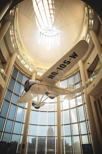 When my fiancé now husband and I toured the Oklahoma History Center (OHC), the events coordinator did a superb job answering all my questions and questions that I didn’t even think of yet. He showed us all the floors and provided potential layout ideas. It was a warm and welcoming environment. I loved the open layout and all the natural light in the Devon Great Hall. From that moment, I knew we found the perfect venue for our wedding reception. Moreover, I received a list of preferred vendors, which was extremely helpful for me since I did not have a wedding planner. I will say, if you do go about this route, hire a wedding coordinator to execute your day of event. Since the OHC was already familiar with the listed vendors, most of them provided discounts since the OHC is a preferred venue. Additionally, I booked this venue a little more than a year out to secure the date that I wanted. The OHC can provide uplighting in your choice of colors all throughout the halls and technical support if you would like to have a slideshow played. They also provide tables and chairs. The other decorative items will need to come from a vendor. There are as well lots of ideal locations inside and outside of the facility for photos. The museum parking lot is free too and had plenty of spaces, which our guests appreciated. Ultimately, the replica of Wiley Post’s world-famous Winnie Mae airplane overhead and the view of the State Capitol are all too stunning.