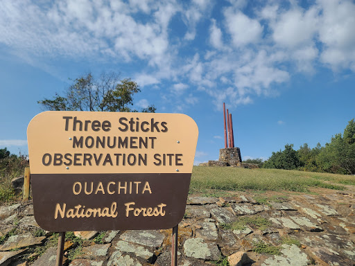 "Three Sticks" was built by the people of southeastern Oklahoma to honor Senator Robert Kerr (1896-1963). Kerr served as the 12th Governor of Oklahoma, 1943-1947 and then US Senator from Oklahoma, 1949-1963. This spot is a peak in the Ouachita Mountains and has a fabulous view.