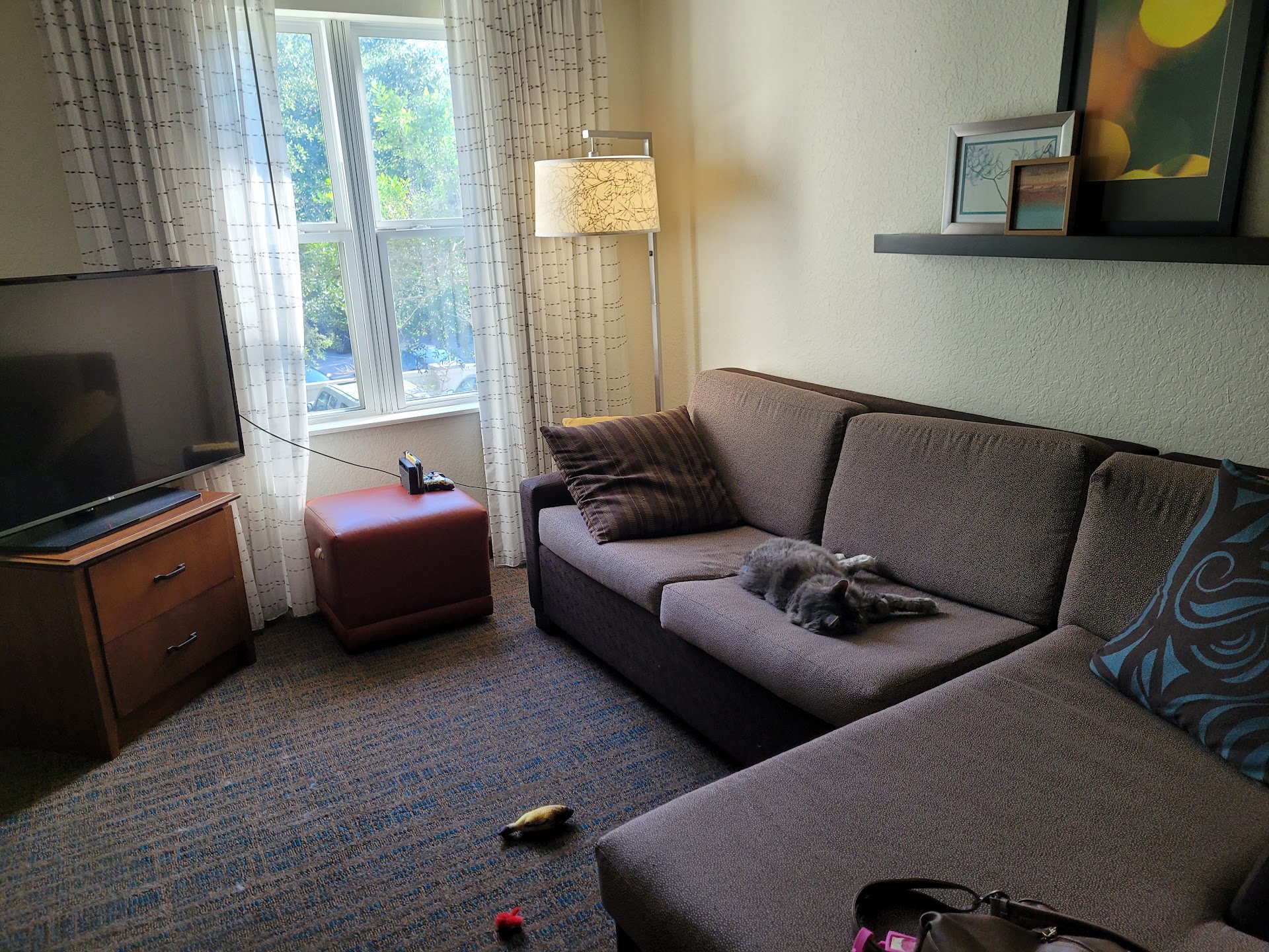 Read moreThe pros: Great location with securely locking outside doors, well lit parking lot, quiet with nothing heard inside room, walkable area. Ample breakfast with standard hot and cold Residence Inn selections. Employees nice. Able to utilize parking and access larger gym room at connecting Courtyard hotel.||The cons: While remodeled, some updates are still continuing and most appear to be appearance-based (new paint, new drapes, new door and cabinet knobs, etc.). Limited paint smell and power saw sounds (not before 8am nor after 5pm). Dog pick-up bags had run out and not replaced during our three day stay. Vinyl sofa very uncomfortable. Odd smell in hallway. Soured strange odor in our room (cleaning chemicals, mold and mildew, unclean carpet?) that never dissipated. AC struggled to keep up and only once cycled off during out entire stay (thank you to Terry for responding to my request for service and for helping me to set the thermostat to 70o when I checked in) thus assisting in prolonging the aforementioned odor and wet damp feeling. Some hallway noise coming from inside rooms when passing by. Room itself is dark and could use another lamp or ceiling light fixtures; gloomy. One bedroom had a bedside clock and the other room did not. One bathroom had a vanity cabinet underneath the sink while the other did not and had bare pipes with hair dryer and extra toilet tissue stored in the bedroom closet. Three sleak new phones in room with only two of them working. One of two toilets had a tendency to run a bit after flushing. ||Unsure of confusion upon check-in, as front desk was not aware of small dog being with us nor my request for a room on a high floor. Both requests were made, confirmed via email and visible via Marriott website booking 11 days prior to my arrival (shame on me for not phoning the hotel front desk to make sure; never had to with any other hotel locations). While not guaranteed, would have expected better service and more effort to honor my request due to Marriott Gold Elite status.||Will reserve the new TownePlace Suites on US Hwy 19 in...