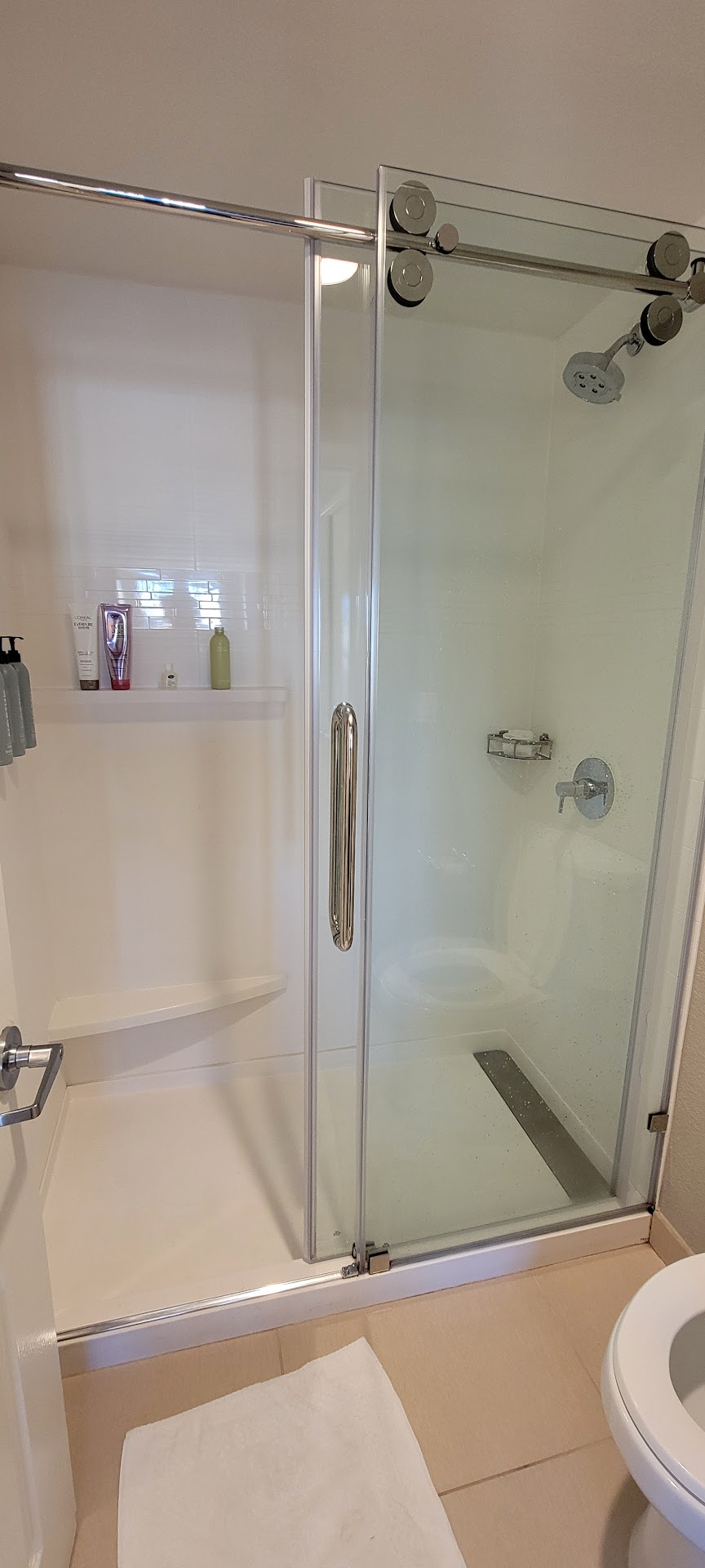 Shower design is AWFUL- Step into the shower before you turn it on, and adjust the head sideways. Let it warm up for 10-15 before you actually need a shower, too.