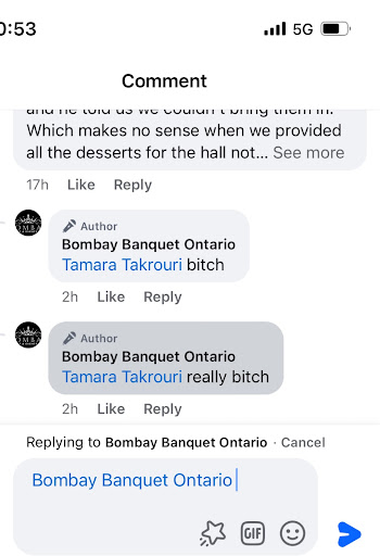 The attached photo is the owners response to my friendâs review on Facebook. Instead of apologizing and showing us proper customer service, He had the nerve to reply to her and call her a bad name. This is the kind of person this owner is. Unprofessional, un caring and doesnât take the time to make anything right. I would never rent a hall from this man again and I wouldnât recommend you do it either. We rented plenty of halls in the past and have never had the owner walking around making guests feel uncomfortable and yelling at his employees the...