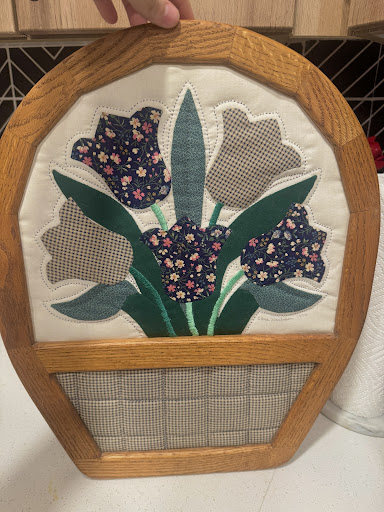 I found this beautiful piece at my local vintage shop and fell in love instantly. When I got home I noticed it was signed on the back, “Tulip basket Designed + Handcrafted by Boe & Edna Harbison In the Woods Ontonagon, MI 1996”