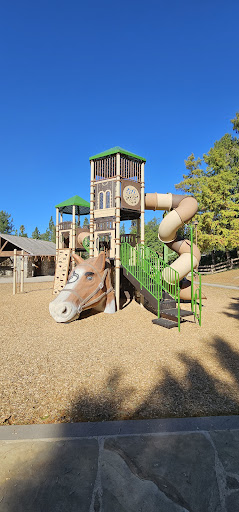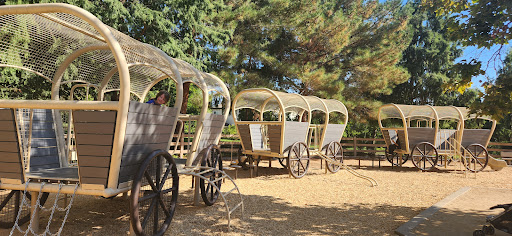 Read moreFun park that is themed "pioneer" -- complete with covered wagons. A couple more swings than I've seen at most parks. Plenty of shade, tables, benches. Cute, covered bbq area for parties; a small walking trail that goes around the circumference of the park; big grassy hill; restrooms; and I believe a half basketball court. And bonus: cute water feature area for kids to get wet during the summer. (I think last day is Sept 30.) Also, location has a "tucked away" feel to it. One of our favorites. Parking can be limited right in front but if it's full you can drive around off Jamboree to park in the Salvation Army parking lot and there are steps from there right down...