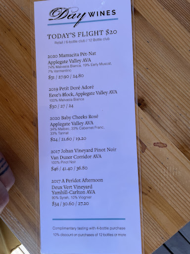 Read moreI'd driven by Day Wines so many times with the idea that one day I would not drive by. July 5th was the day that my friend and I decided to have our 1st visit and, hopefully, enjoy some wine tasting. Our server, Leyla, was awesome! With her help, and only after having tasted one wine, their Isla Vermentino, we purchased a chilled bottle of it and enjoyed every delicious sip! With a dish of crisp potato chips to accompany our wine, we soaked up our peaceful and relaxing wine experience as we sat in their beautiful covered patio. This was a great wine experience for both of us, and we will be sure to come back again and again to try their long...