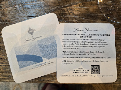 Read moreThis was a perfect first stop. My sister and I had an extra day after a wedding in Portland Oregon, and we decided to treat ourselves to a trip through Willamette wine country. Our first stop was Four Graces, on a whim. We were delighted. The setting was right off the highway, but adorable. The scattered, comfortable seating options behind the main house felt miles away from any roads. The service was excellent, with two sommeliers checking in on us, both of whom were charming and informative, and neither was at all pushy. They explained to us two of the different soils that the famous pinot noir grapes were grown in and we were able to taste the difference in the wines - given our lack of wine experience, we were thrilled with our new expertise. we relaxed, enjoyed truly delicious pinots (gris, grigio, noir) and at the end got a recommendation for some fancier wineries "up the hill". We followed their advice and had more good experiences, but looking back, this one was our favorite! Special...