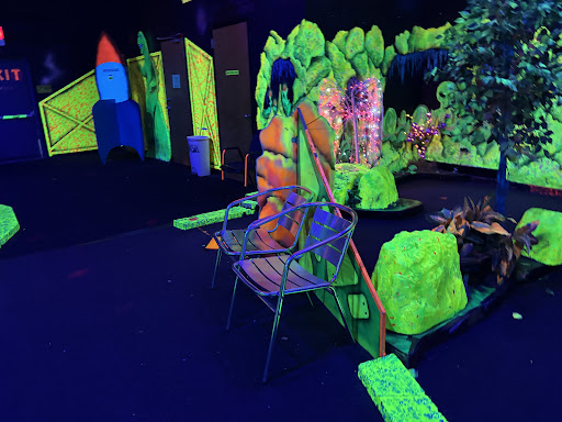Read moreThe concept of space golf is great. The idea of reservations is great. Arriving 15 minutes before your reservation is a common courtesy and is expected, BUT this should mean the people entering at their proper reservation time should have at least a 15 minute "jump" on playing. We arrived 15 minutes before our reservation time. It took about 10 minutes to pay and then receive our putter and pick our ball. We had 2 adults and a 9 year old child. So choosing a color took an extra minute. We entered the space golf area, where there is a sign stating "put 3D glasses on now"... hold up, game changer... glasses? 3D? We didn't even see it advertised. So puzzled, we inquired. It was an extra $1 per person for glasses. So we paid for that. Also took a few minutes. Once all organized and inside we proceeded to play. By the time we reached hole #3 we had people behind us waiting on us to finish so they could play. That made us feel rushed and anxious so we tried to hurry up a bit, which took the fun out of it for us. Especially if you were trying to have a fun little competition. We eventually finished all 18 holes... with 2 total different parties waiting on us to finish. *If they can organize their time slots and maintain that 15 minutes in between allowing customers, that would be another star given. * They have a food kiosk and an arcade area as well. Also sell some t shirts and other novelties. Another star not given... they encourage photos without flash, but I didn't want to feel as if I was not being courteous of those waiting behind us. It was our first time going and I wanted to take pictures.