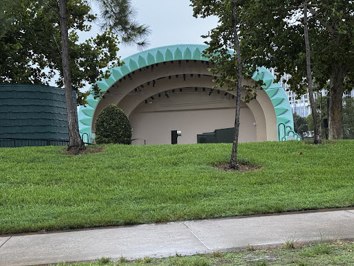 The Walt Disney Amphitheater at Lake Eola Park is a small but striking architectural gesture within the heart of Orlando. Its bold, shell-like form immediately stands out against the calm backdrop of the lake, almost like a floating sculpture rather than just a performance venue. The geometry is playful, with its sweeping curves and bright colors giving it a sense of lightness that complements the park’s atmosphere.
