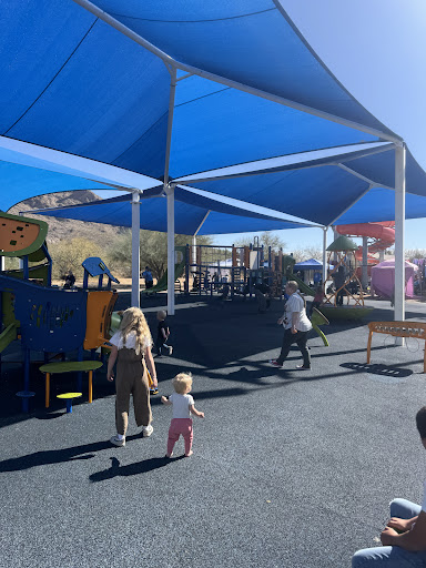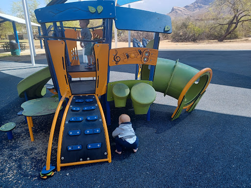 Google tends to give directions to James Kriegh Park to the upper parking lot. I prefer parking in the parking lot down below. This one is for the Oro Valley Aquatics center and overlooks Canyon Del Oro High School. This park went through a face lift in the last few years. It is great for all ages, including a little bit more of a challenging play structure for the older kids complete with ropes to climb across and monkey bars. If you bring hot wheels cars, there is a track on the smaller Plat structure. There are musical pipes and drums. Three spinning things, and both regular swings and those that have a full seat/back/ and front that lowers over the child. This park truly offers something for all ages. The main Ramada has three or four tables. There is another Ramada with about three tables. The play strictures do have blue tent/tarp coverings as well. This park does...